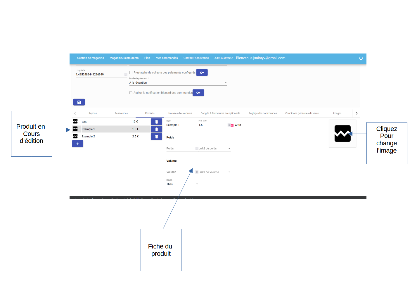 Pour qu'un produit soit affichable dans la page du magasin. Il est nécessaire d'avoir un rayon associé.