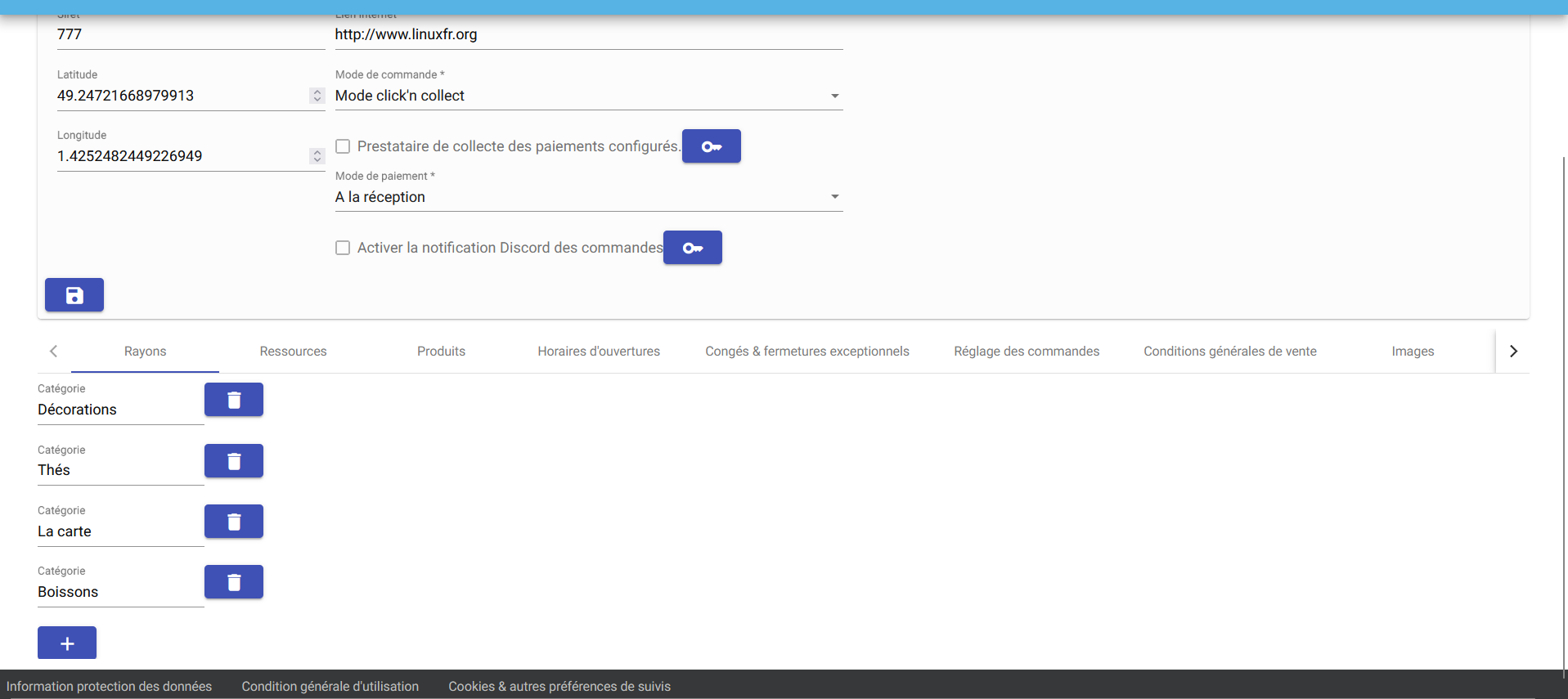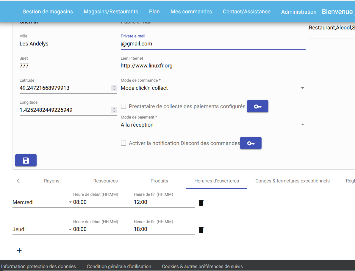 - Horaires d'ouvertures- gestion des horaires d'ouvertures du magasins.